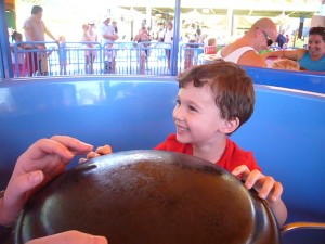 The park is divided into two parts, dry rides and wet rides. I thought Tyler would go nuts over all the water slides they have but Tyler said he didn’t want to go on any water rides (half the park, we are all wearing bathing suits, we are toting around towels and changes of clothes). We had lunch and while Grant was getting the food I asked Tyler why he didn’t want to go on any of the water rides. “Water is dangerous,” he said. If you’ve read this blog before you know that Tyler has an issue with any body of water except the bath tub, only I don’t know why. There’s never been any incidents and it frustrates the Hell out of me trying to figure out what the trouble is.